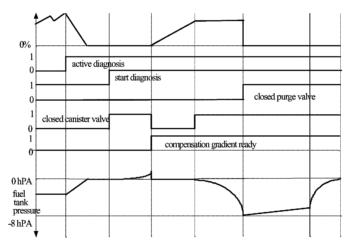If a large lean correction of the lambda controller is detected, monitoring is stopped. If monitoring were to be continued, idle instability will occur because of the high canister load. If the negative pressure build-up gradient is below a certain threshold, a large leak is detected and the diagnosis is complete. If the pressure reaches a certain threshold (ex. -8 hPa), the TEV is closed. If the pressure reaches a specific threshold (ex. -15hPa), a TEV malfunction is detected (TEV stuck open) and monitoring is stopped.