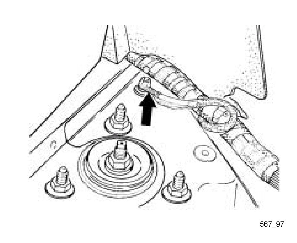 Ground point 9 (arrow) is located in the passenger compartment behind the right-hand spring strut attachment.