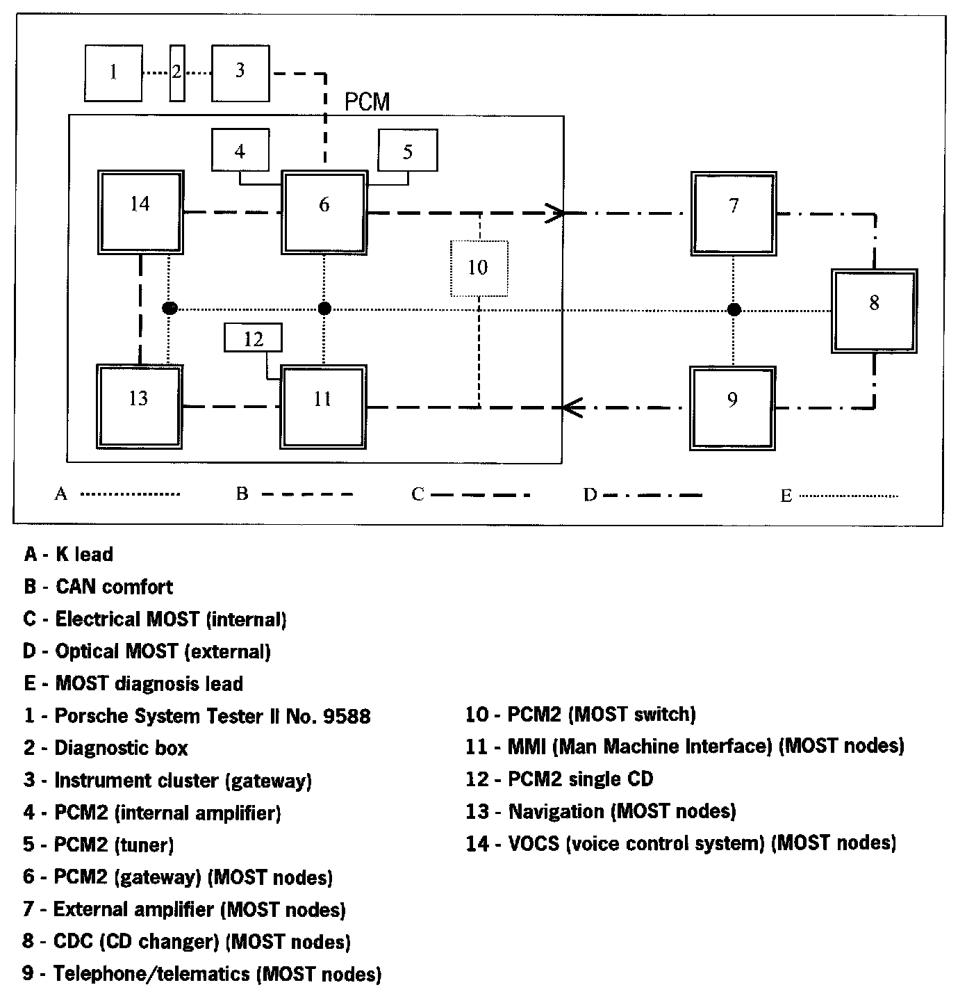Communication between the Porsche System Tester II No. 9588 and the MOST control modules only takes place via the K lead to the instrument cluster. The data is transferred from the instrument cluster gateway to the MOST control modules, via CAN Comfort to the PCM2 gateway, via the electrical MOST in the PCM2 and via the optical MOST outside of the PCM2.