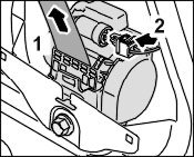 2. Disable the fuse -2- for the electrical plug on the belt tensioner with a screwdriver in the -direction of the arrow-.