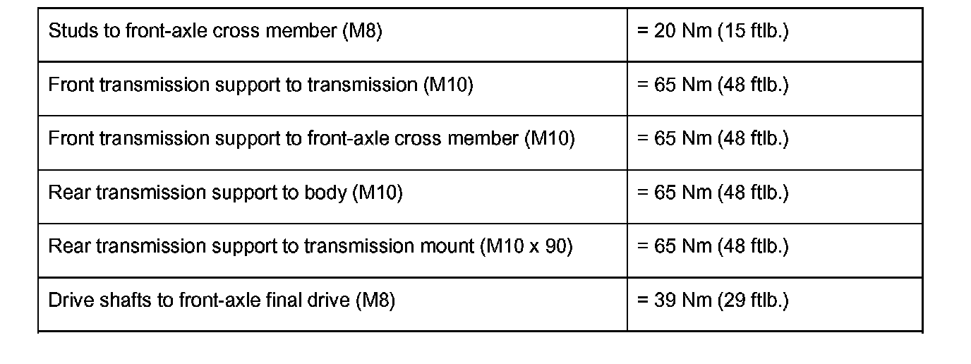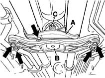 ^ If the hexagon-head bolt (M10 x 90) was undone on the rear transmission support/transmission mount, it is important to tighten the front transmission support first, then the rear transmission support and the M10 x 90 screw on the rear transmission mount last.