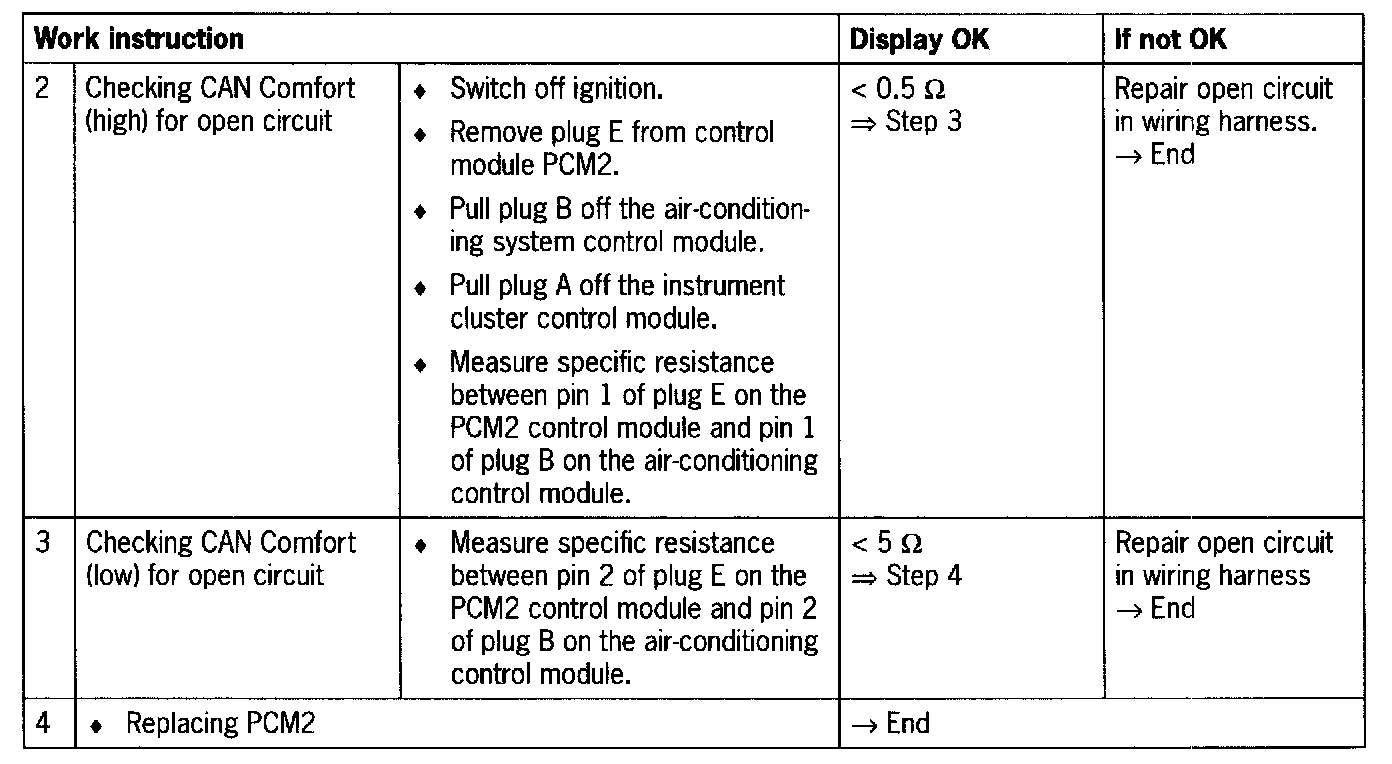 NOTE: The plug connections of control units connected to the CAN-Bus Comfort are disconnected for troubleshooting. This causes additional CAN-relevant fault codes, e.g. "8005 instrument cluster," "800A air conditioning" to be stored in the PCM2 fault memory. These fault codes should be initially ignored and should be deleted on completion of the troubleshooting.