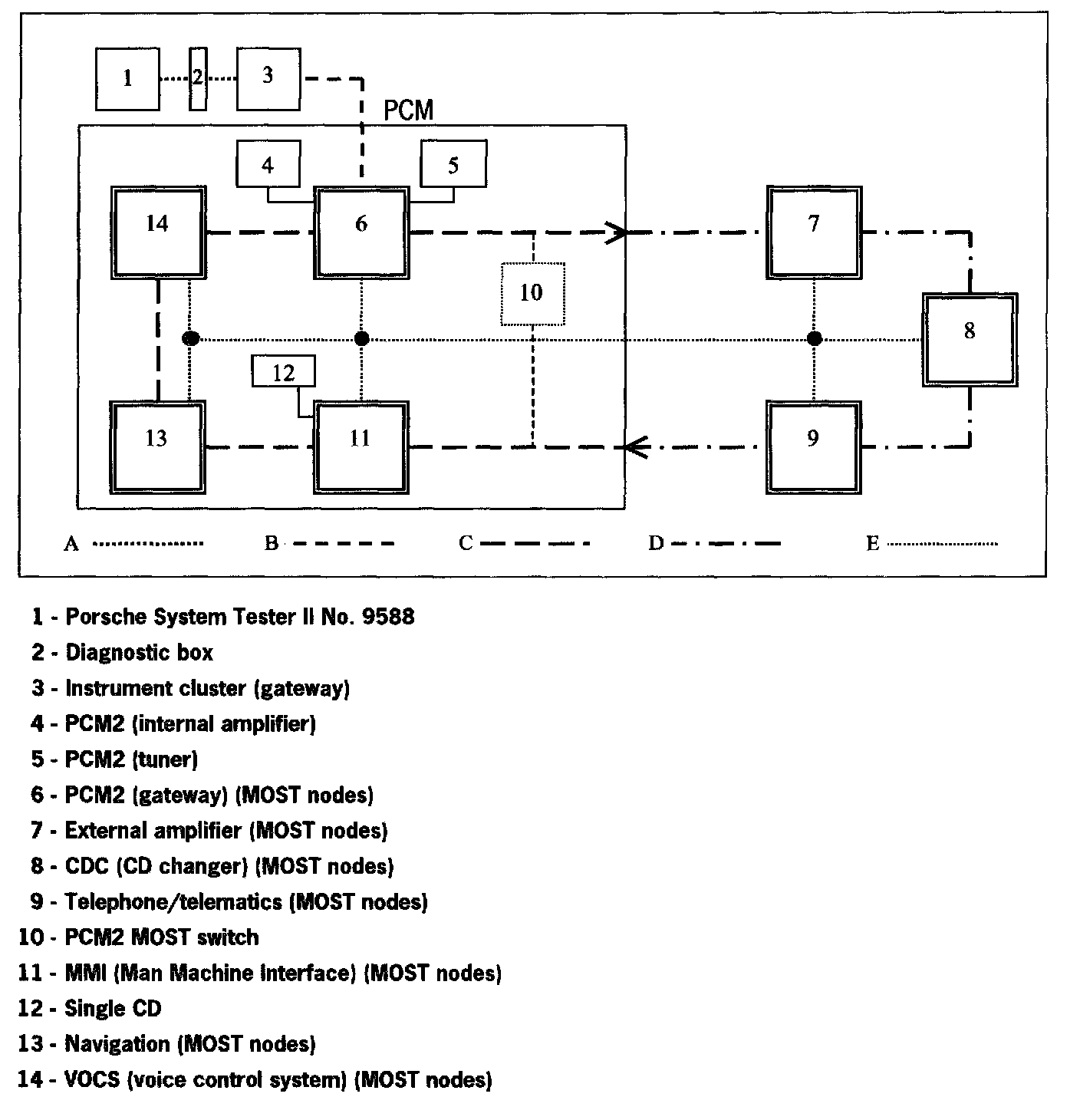 The diagnosis distribution line is connected to the following MOST control modules: