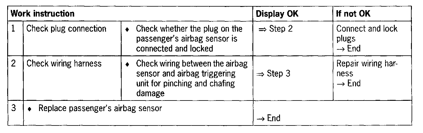 - Short circuit to B+/ground or open circuit in the wiring between the passenger's airbag sensor and the airbag triggering unit