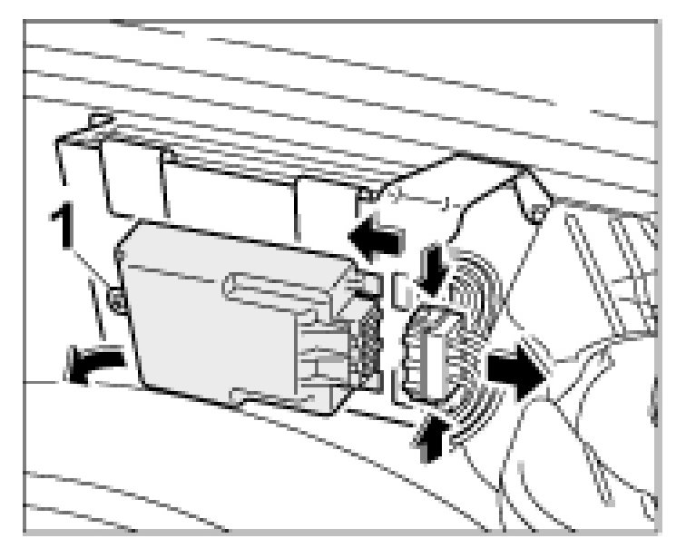 1. Open the luggage-compartment lid and if present, detach the additional amplifier on the clip -1- and detach the additional amplifier (in the direction of travel) to the right.