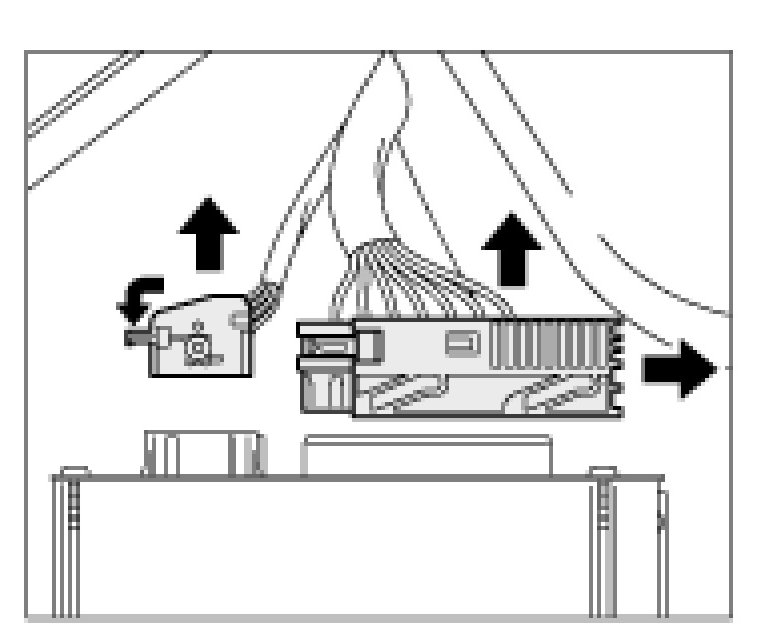 2. Press connectors -arrow- together and pull apart. Remove additional amplifier.
