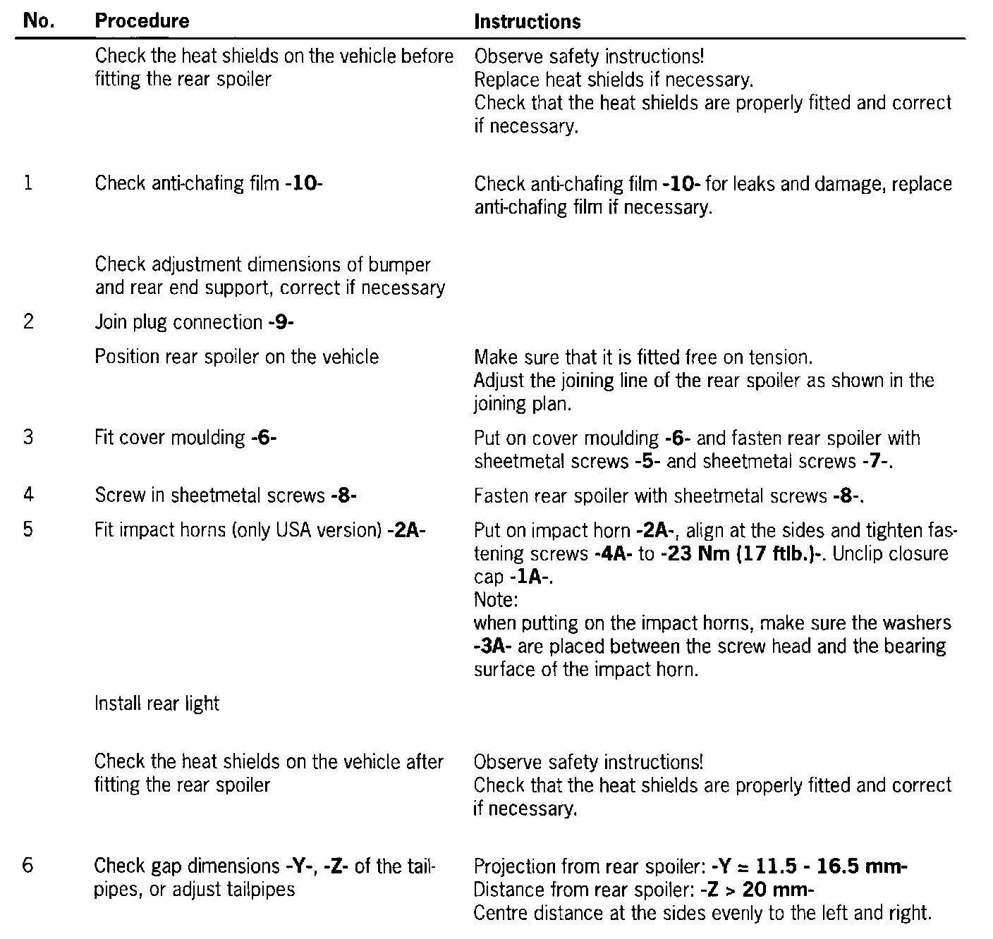 - After assembling the rear spoiler, check the heat shields for leaks.
