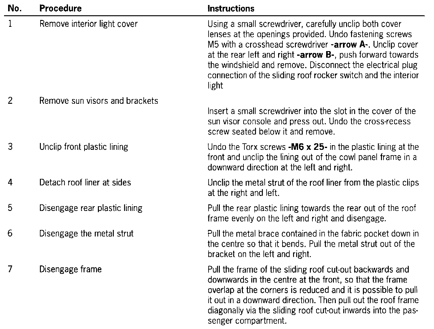 - The sliding roof panel must also be removed! Refer to "Removing and installing sliding roof panel".