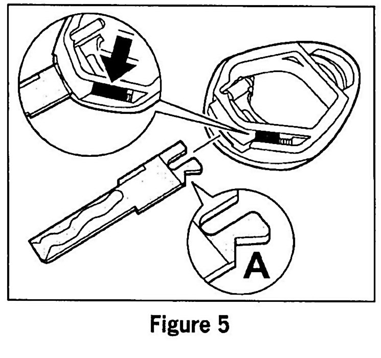 2.2 Push key blade in lower part of key housing until the sliding latch, Figure 5, arrow is felt to engage.