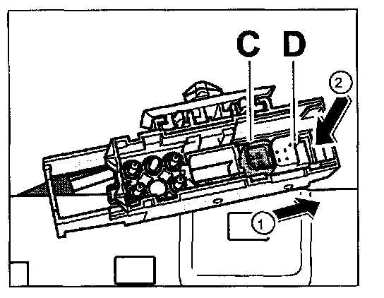 3. Pin housing: Push out the belt buckle -D- and seat heating -C- in -direction of arrow 1-.