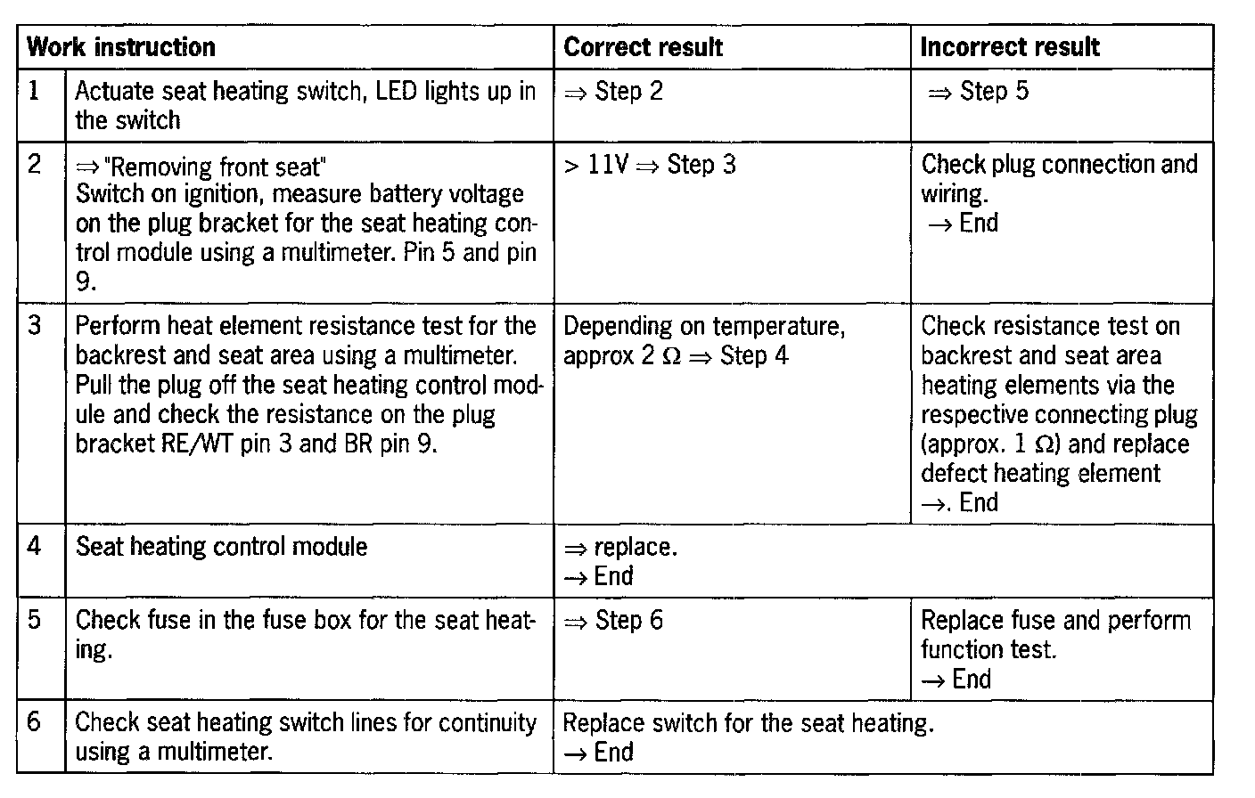 In the case of the complaint "seat heating does not function", proceed according to the following work instruction.