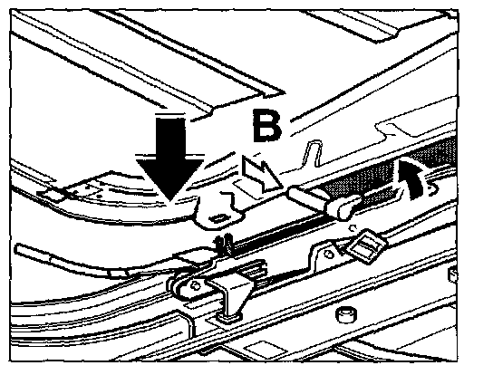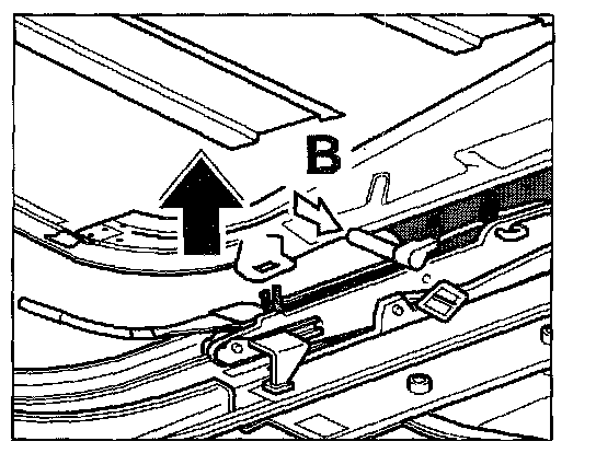 - Pull out the connector springs -B- on the gate and push in sliding/tilting roof trim. Push inner panels under the sheetmetal panel of the sliding/tilting roof trim.
