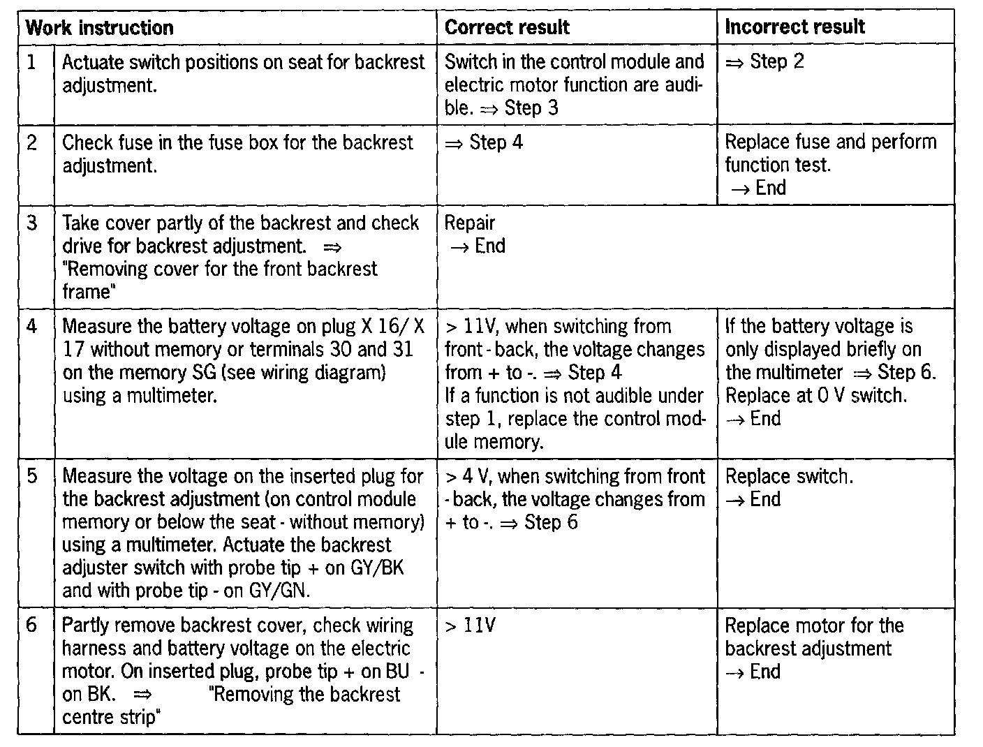 In the case of the complaint "backrest adjustment does not function", proceed according to test plan. As the seat functions vary, the test plan principally complies with the seat version with seat memory adjustment.