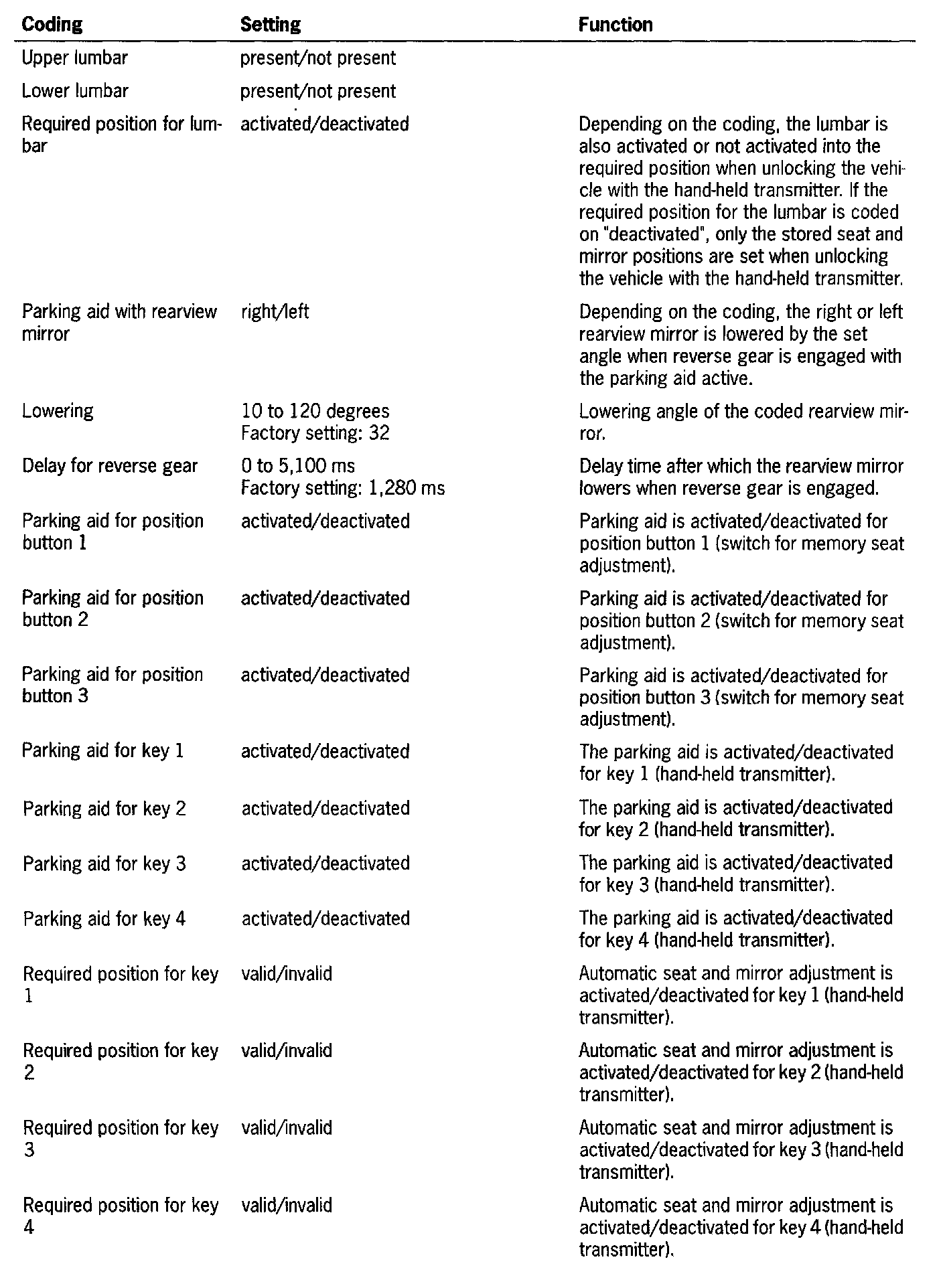 The following settings can be selected from the menu and encoded under the menu item "Modify coding":