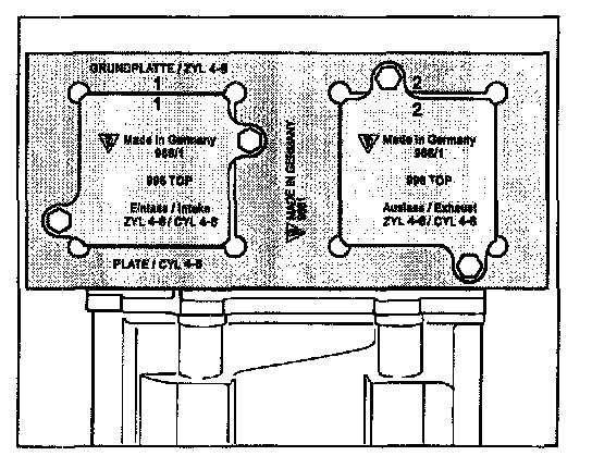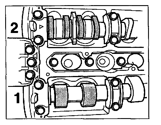 10. To set the timing, the respective cylinder side must be positioned to overlapping TDC. For this purpose, turn the engine at the belt pulley of the crankshaft (in operating direction) until the maximum defection (reversing point) is attained on the dial gauge. The cams of the 1st cylinder point towards each other -Figure 10.1-, the cams of the 4th cylinder point away from each other (each points towards cylinder head outer wall) -Figure 10.2-.