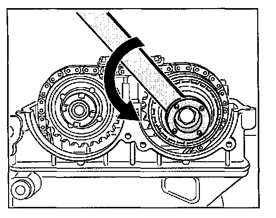 11. Turn camshaft adjusting element of the inlet camshafts to its left stop. Use special tool holding wrench No. 9653 to turn the actuating element of the inlet camshaft counter-clockwise until it meets the stop.