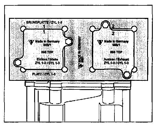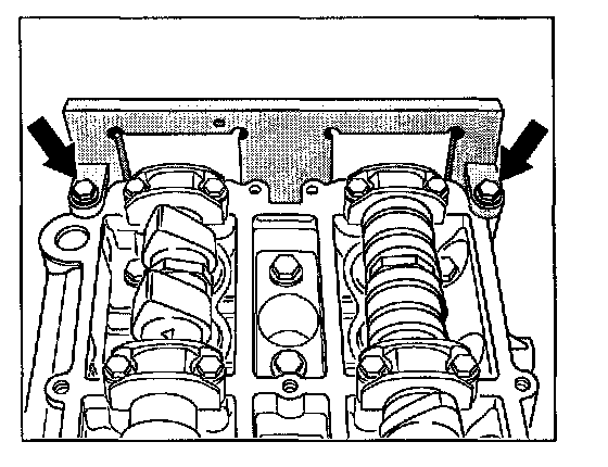 12. Fit adjustment devices. Use two screws to fasten the frame of both staking tools at the end of the cylinder bank (clutch side) on the sealing surface for the valve cover. Tighten screws by hand only.