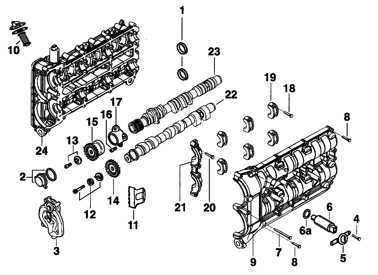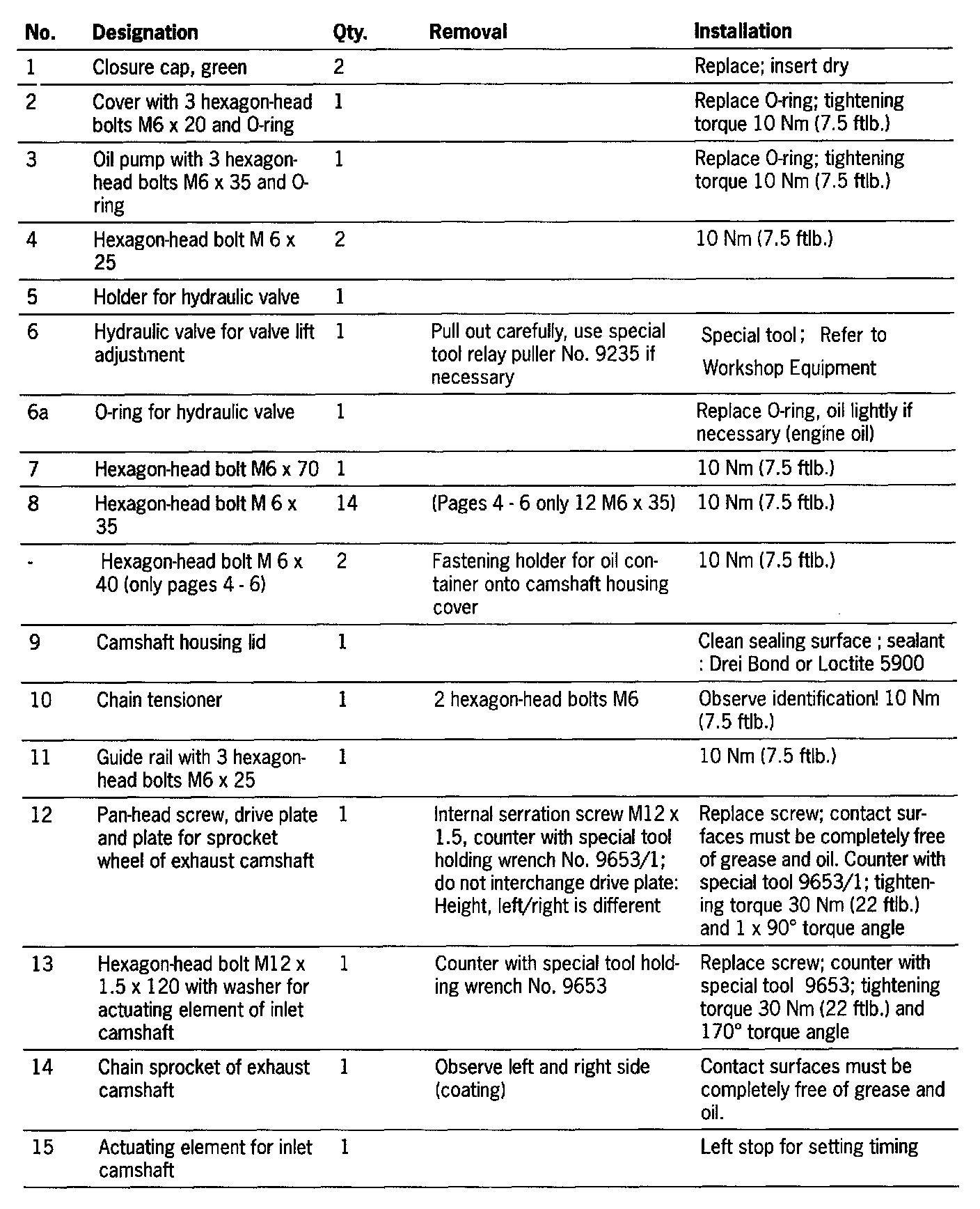 7. Remove camshaft housing cover. Unscrew the 15 hexagon - head bolts M6 and remove the camshaft housing cover. If this is stuck, it can be loosened by gently tapping with a plastic hammer.