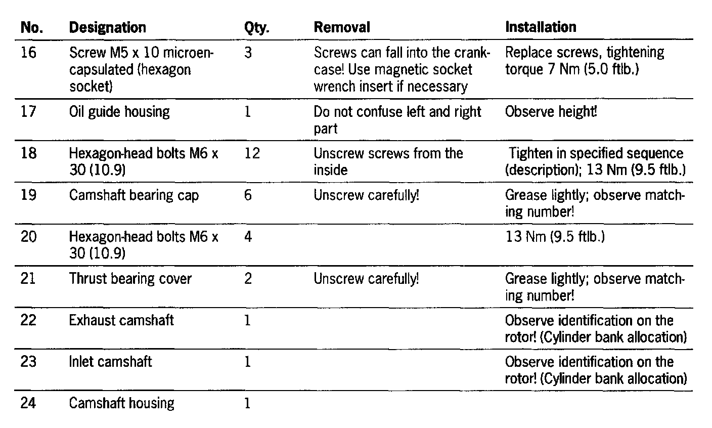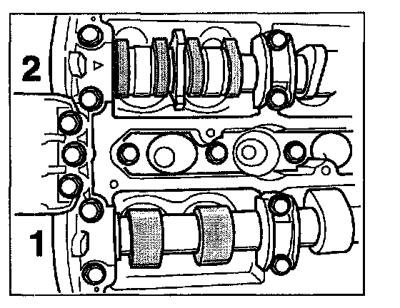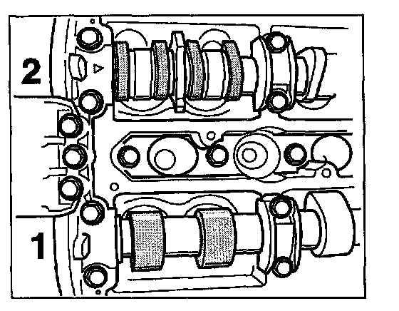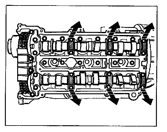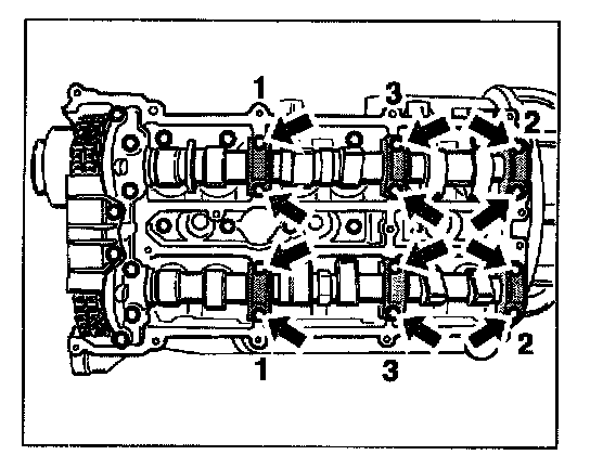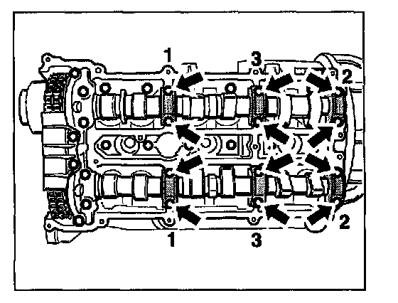 13. Remove camshaft bearing cap. To do so, uniformly unscrew the hexagon-head bolts of the relevant bearing covers from the inside. Remove the bearing covers in the specified order.