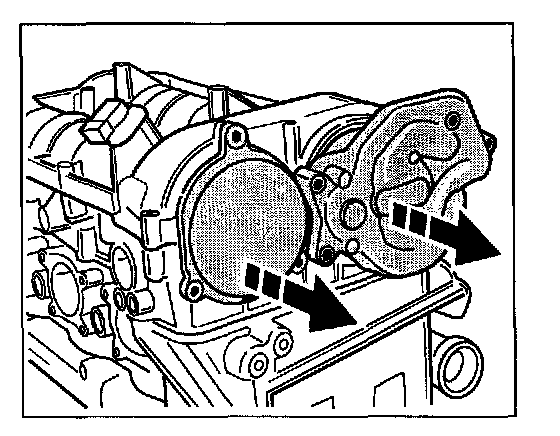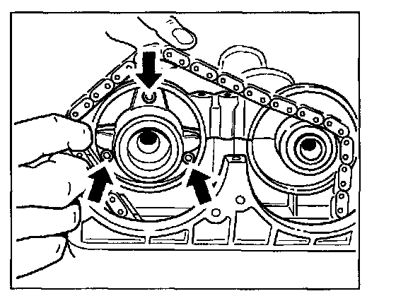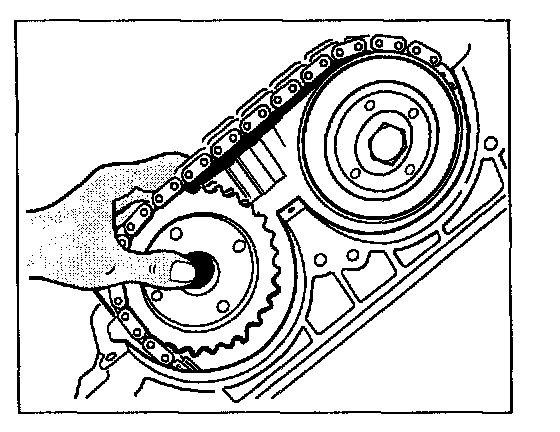 9. Remove chain tensioner. To do this, unscrew the two fastening screws of the chain tensioner cover and remove the cover. Then remove the chain tensioner.