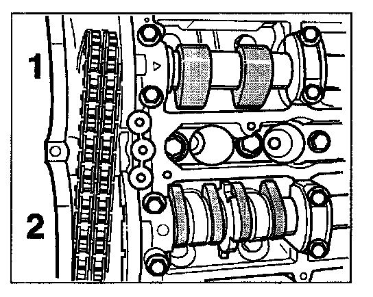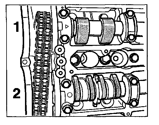 8. Check engine position. The cylinder side which is to be worked on must be positioned to overlapping TDG so that the camshaft can be removed without tension. For cylinder bank 1 - 3, this means: the cams of the exhaust and inlet shaft of cylinder 1 point towards each other -Figure 8.1-, for cylinder bank 4 - 6: the cams of the exhaust and inlet camshaft of cylinder 4 point away from each other (each points towards the cylinder head outer wall) -Figure 8.2-.