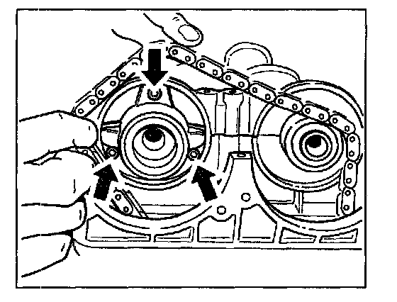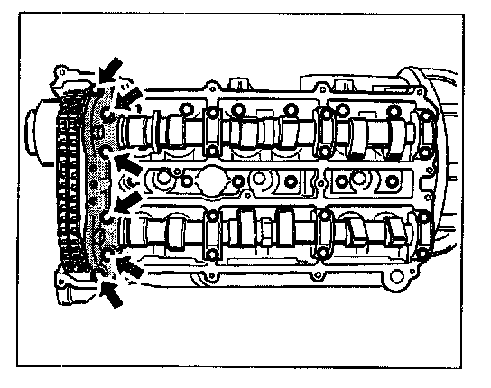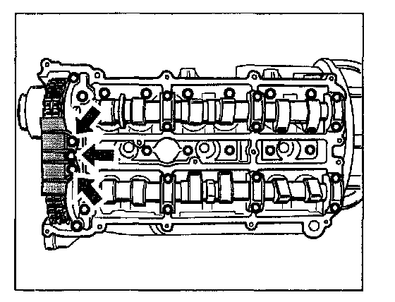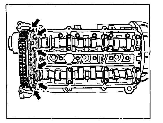 3. Insert camshafts. The bearing locations of the camshafts must be lightly greased before installation. Place the timing chain over the camshafts when inserting the camshafts.