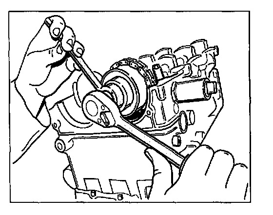 11. Remove camshaft sprockets. The timing chain must not be loaded when the screw connection of the camshaft sprockets is loosened. To remove the sprocket wheels, the actuating element of the inlet camshaft must be countered using special tool holding wrench No. 9653, and the sprocket wheel of the exhaust camshaft must be countered using special tool holding wrench No. 9653/1.