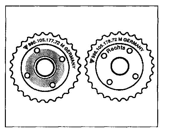 New chain sprockets for the exhaust camshafts (left and right part) have been in use as of May 2001. The identical chain sprocket remains an original Porsche part - observe part numbers
