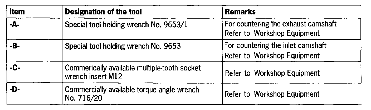12. Tighten sprocket wheels. Check whether the actuating element of the inlet camshaft is still on the left stop. Subsequently tighten the sprockets of the inlet and exhaust camshafts with initial tightening of 30 Nm (22 ftlb.). When doing so, counter the sprockets using the appropriate special tools holding wrench No. 9653 or holding wrench No. 9653/1. Subsequently remove the holding keys No. 9661/1 and tighten the exhaust camshaft with a 90 degrees torque angle and the inlet camshaft with a 170 degrees torque angle. Counter camshafts with the appropriate special tools.