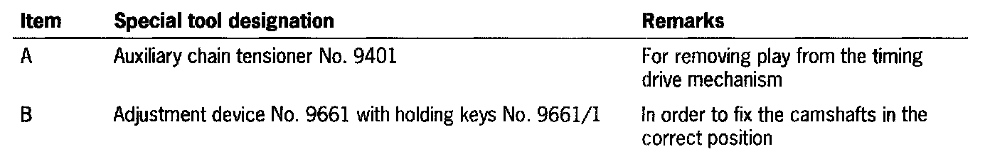 1. Unscrew camshaft sprockets. To undo the screw connection, the camshaft adjusting elements (inlet shaft) must be countered using special tool holding wrench No. 9653 and the sprocket wheels (exhaust shaft) must be countered using special tool holding wrench No. 9653/1.