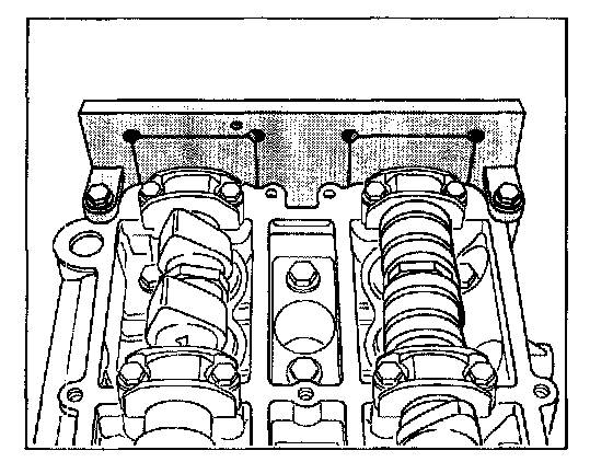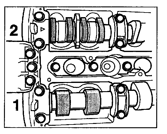 8. Set camshafts on cylinder side 1 - 3 (cams of both camshafts point towards each other on cylinder. To do this, use a suitable open-ended wrench (a/f 30) to turn the hexagon on the camshafts until the holding key of the staking tool easily enters the slot of the camshaft. Fix holding keys with both hexagon-head bolts.