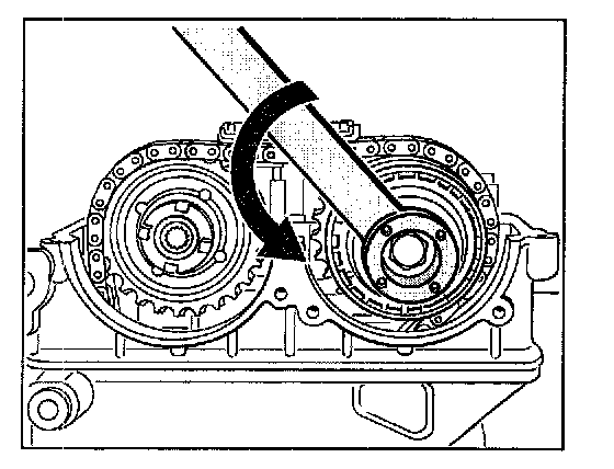 5. Turn camshaft adjusting element of the inlet camshafts to its left stop. Use special tool holding wrench No. 9653 to turn the actuating element of the inlet camshaft counter-clockwise until it meets the stop.