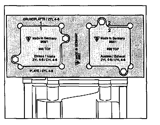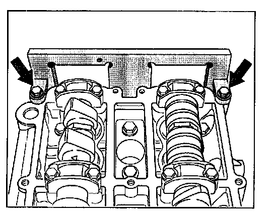 6. Fit adjustment devices. Use two screws to fasten the frame of both staking tools at the end of the cylinder bank (clutch side) on the sealing surface for the valve cover. Tighten screws by hand only.