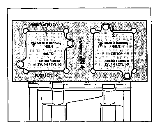 4. To set the timing, the respective cylinder side must be positioned to overlapping TDC. For this purpose, turn the engine at the belt pulley of the crankshaft (in operating direction) until the maximum defection (reversing point) is attained on the dial gauge. The cams of the 1st cylinder point towards each other -Figure 4.1-, the cams of the 4th cylinder point away from each other (each points towards cylinder head outer wall) -Figure 4.2-.