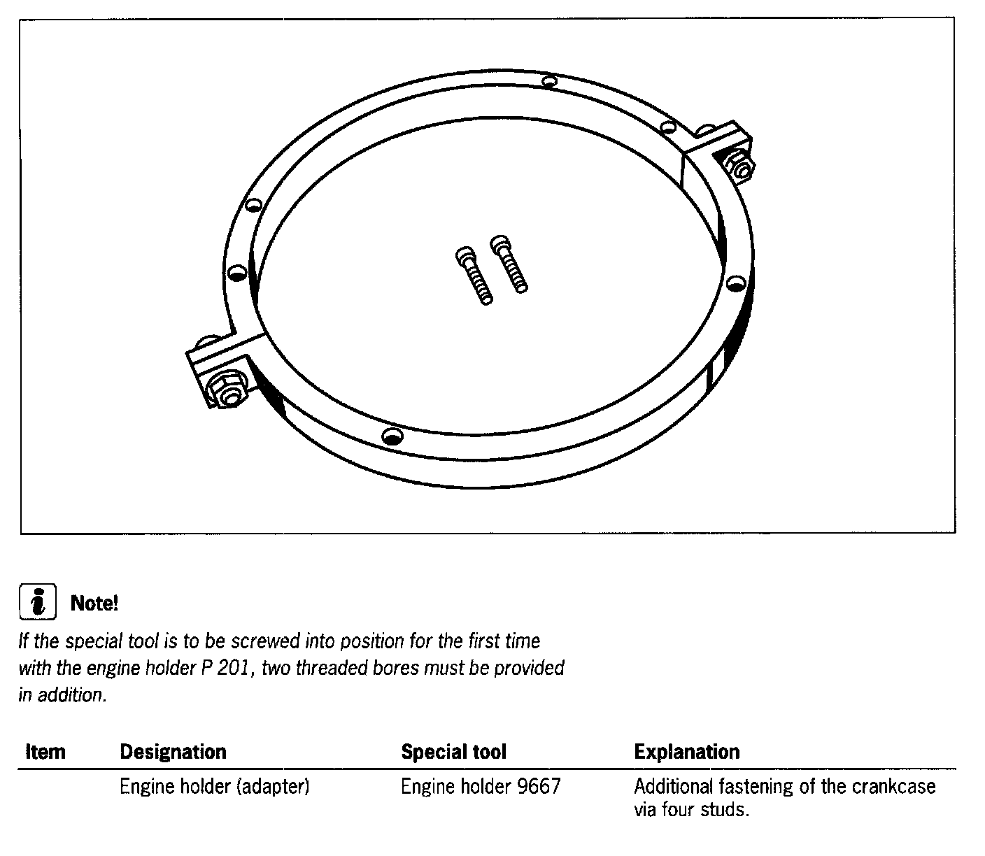 If the engine holder special tool (adapter ring) 9667 is used for the first time 2 threaded bores must be made in addition.