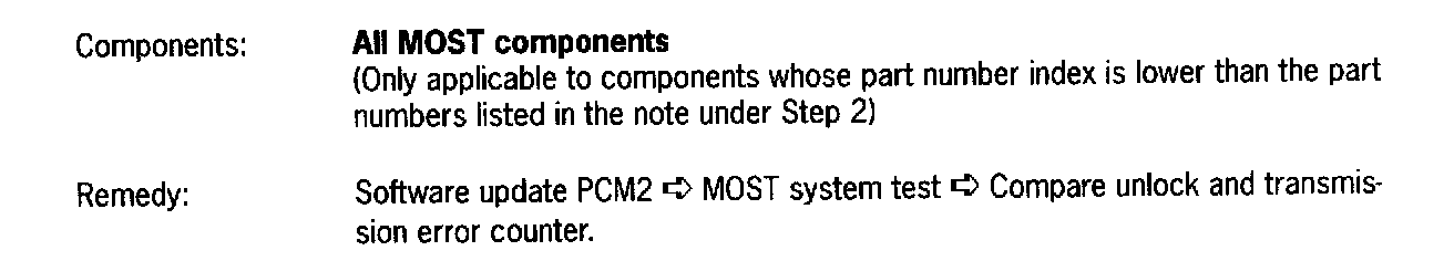This procedure allows the MOST distribution line to be tested again without the "faulty" component, other fault sources to be ruled out, and the result of the unlock and transmission error counter to be compared with the result of the installed component. There is no sound output in the PCM system connection, if the external amplifier (I No. 490, 680) was jumped.