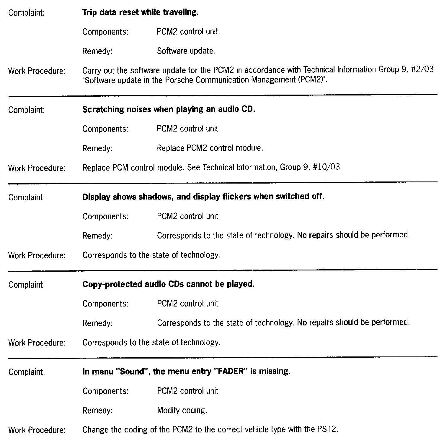 Carry out the software update for the PCM2 in accordance with Technical Information Group 9, # 2/03 - "Software update in the Porsche Communication Management (PCM2)".