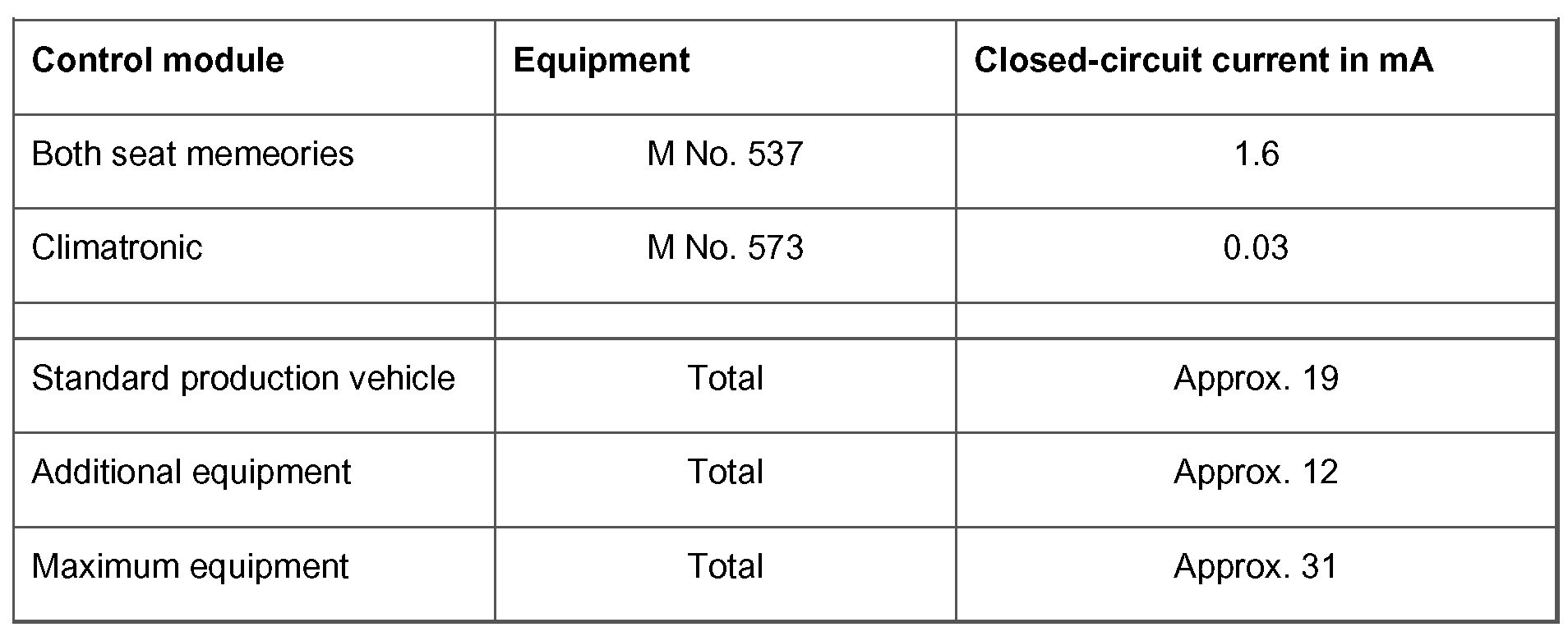 NOTE: Before measuring the closed-circuit current, determine the vehicle equipment (M-numbers) and establish the expected closed-circuit current with the aid of the attached table.