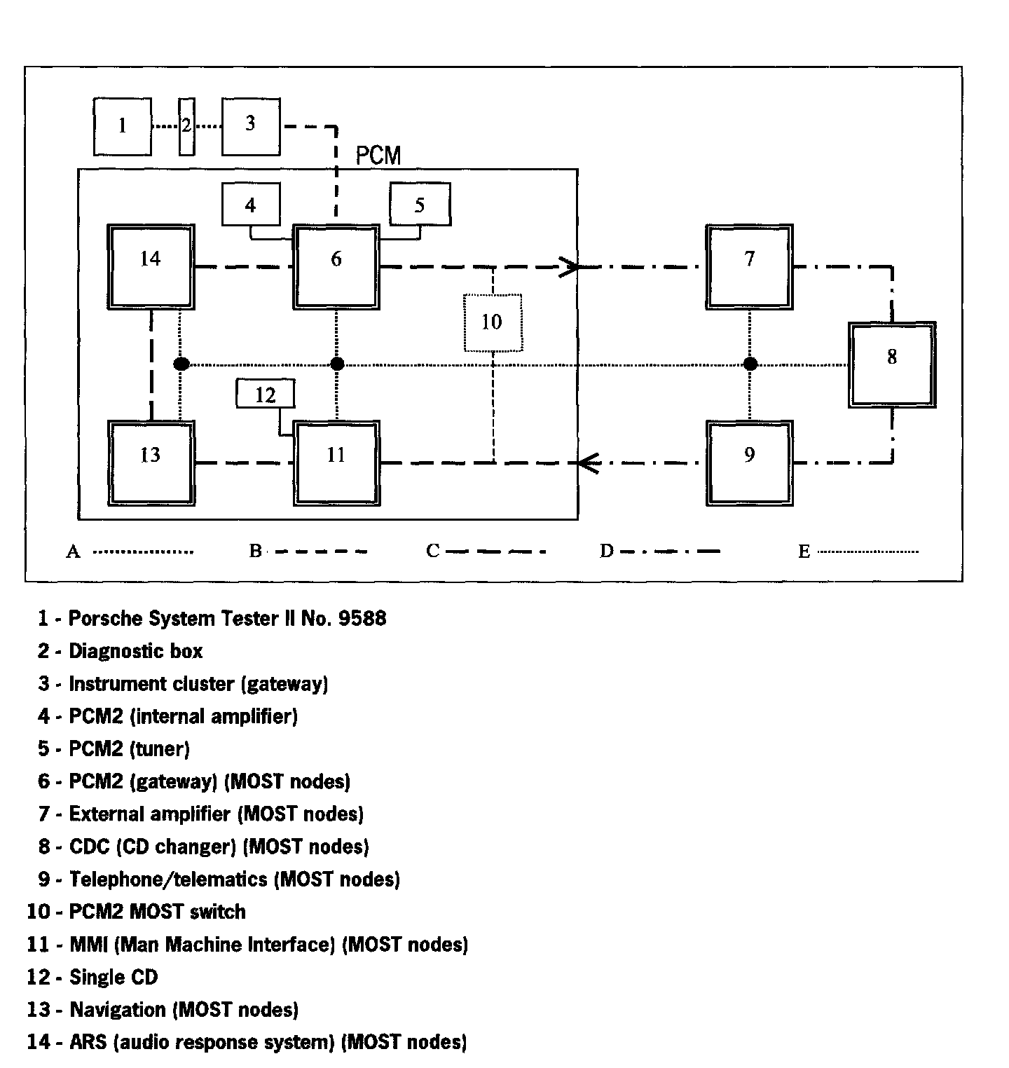 Communication between the Porsche System Tester II No. 9588 and the MOST control modules only takes place via the K lead to the instrument cluster. The data is transferred from the instrument cluster gateway to the MOST control modules via CAN comfort to the PCM2 gateway, via the electrical MOST in the PCM2 and via the optical MOST outside of the PCM2.