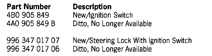 As of the date of introduction below, a modified ignition switch will be installed in vehicles. For spare parts replacement of the ignition switch, only the new ignition switch, part number, 4B0 905 849, is available now as a replacement part.
