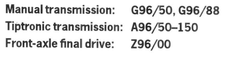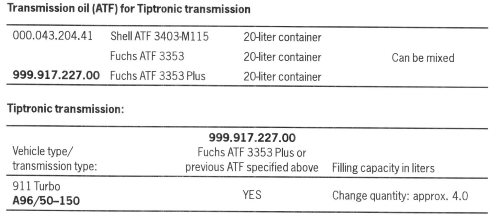 As there are special requirements for the manual and Tiptronic transmission as well as the rear-axle and front-axle final drive of the 911 Turbo (996) and 911 GT2 (996), only the ATF and transmission oil types tested by Porsche are approved.