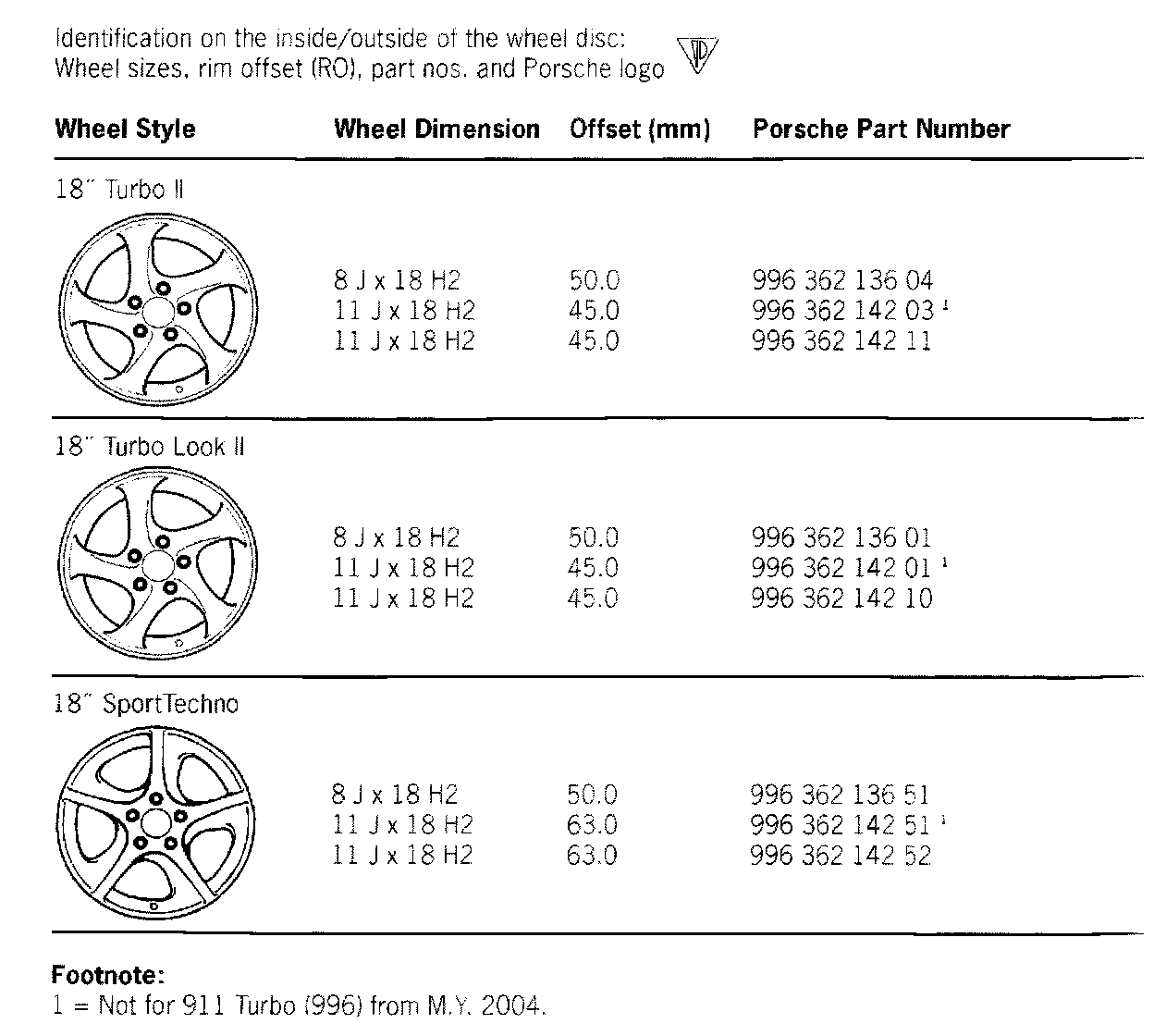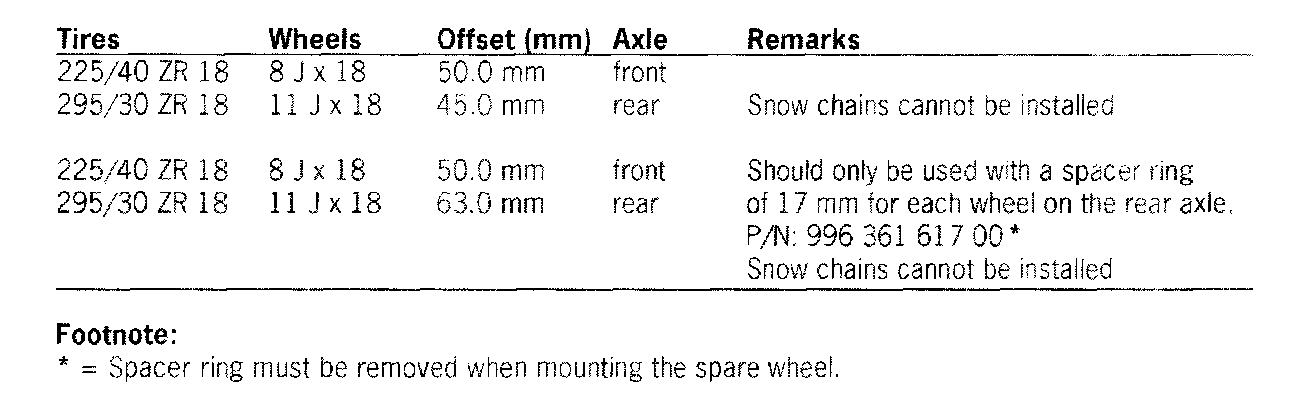 Rubber valves, not for 18-inch Turbo I wheels, Part Number - 900 265 001 50 and 000 044 600 00. Steel valves, for 18-inch Turbo I and SportTechno wheels, Part Number - 993 361 073 00. Always observe any possible instructions concerning the rolling direction and/or specifying which side the tires must be mounted on.