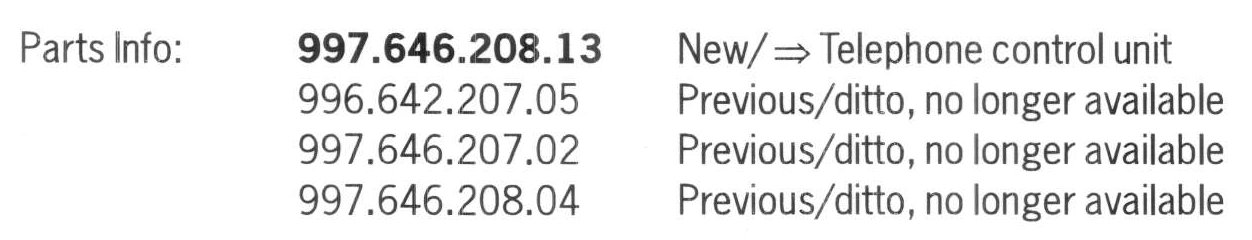 If a replacement part is required, our Parts Department will supply the control unit 997.646.208.13 as a replacement for the previous telephone control units 996.642.207.05 and 997.646.207.02 and 997.646.208.04.