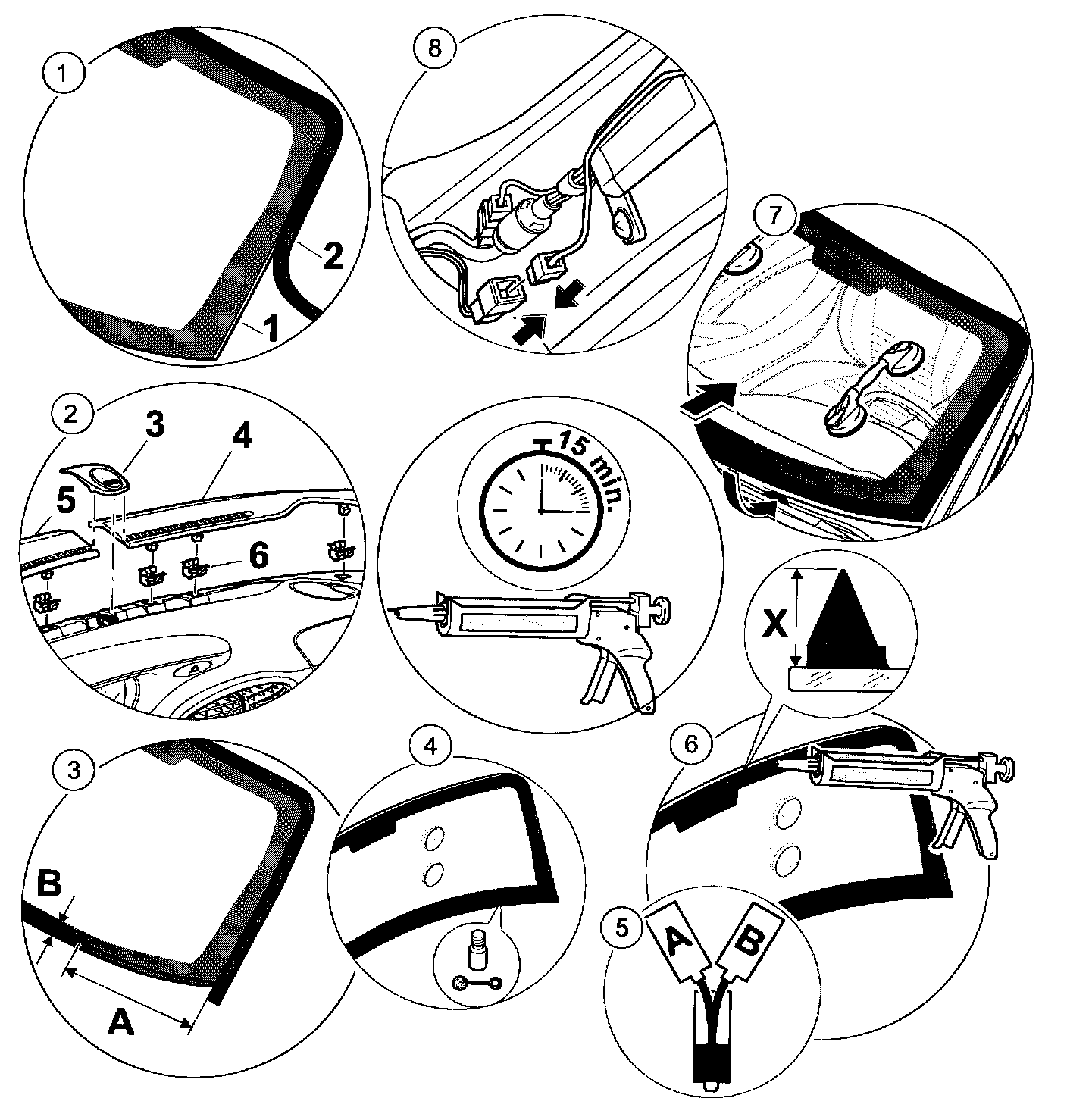 - Time between applying adhesive and inserting windscreen: max. 10 min