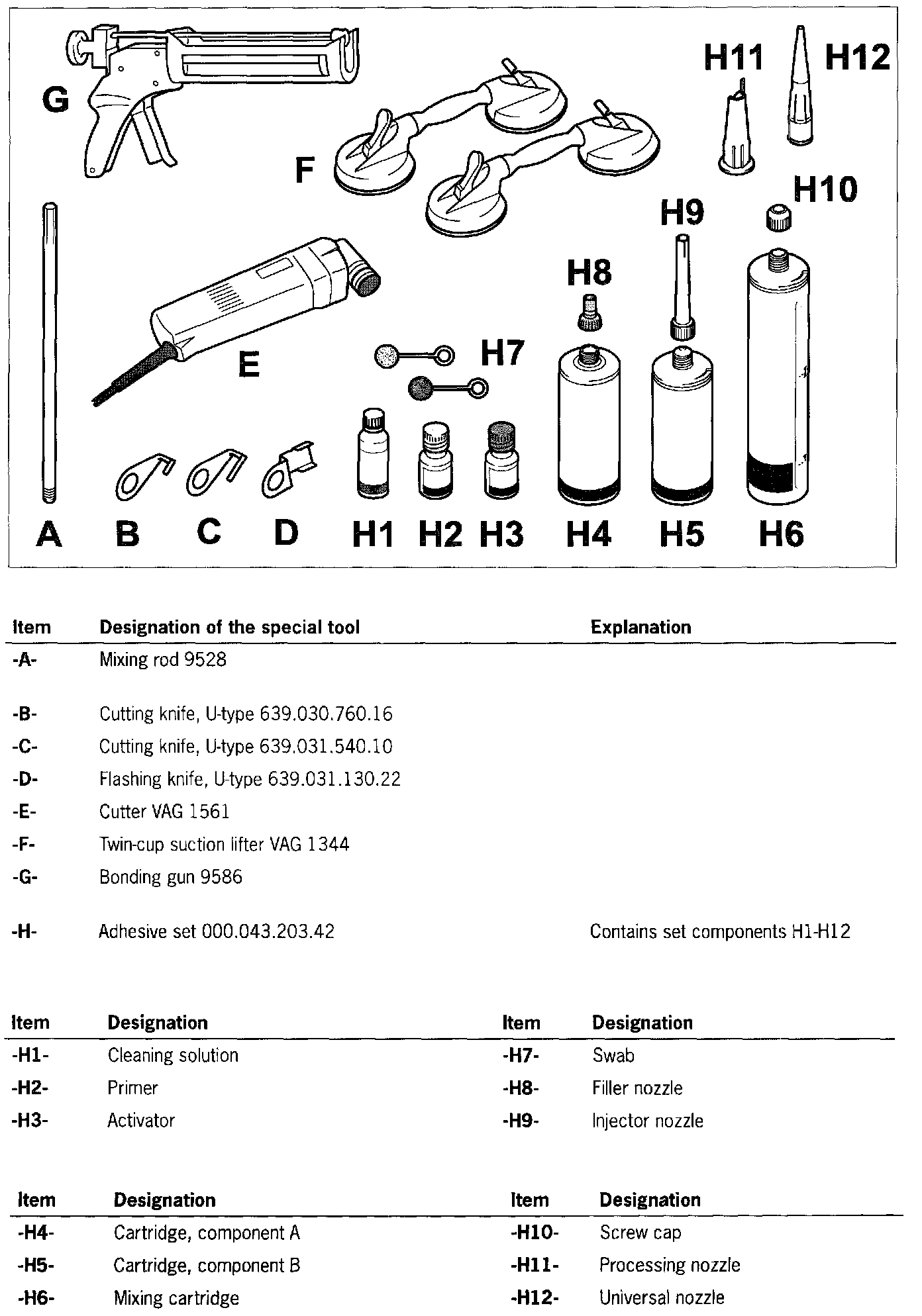 The following tools and materials are required for removing and installing the windscreen with 2-component adhesive: