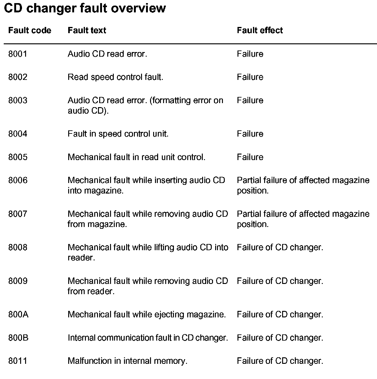 CD Changer Fault Overview: