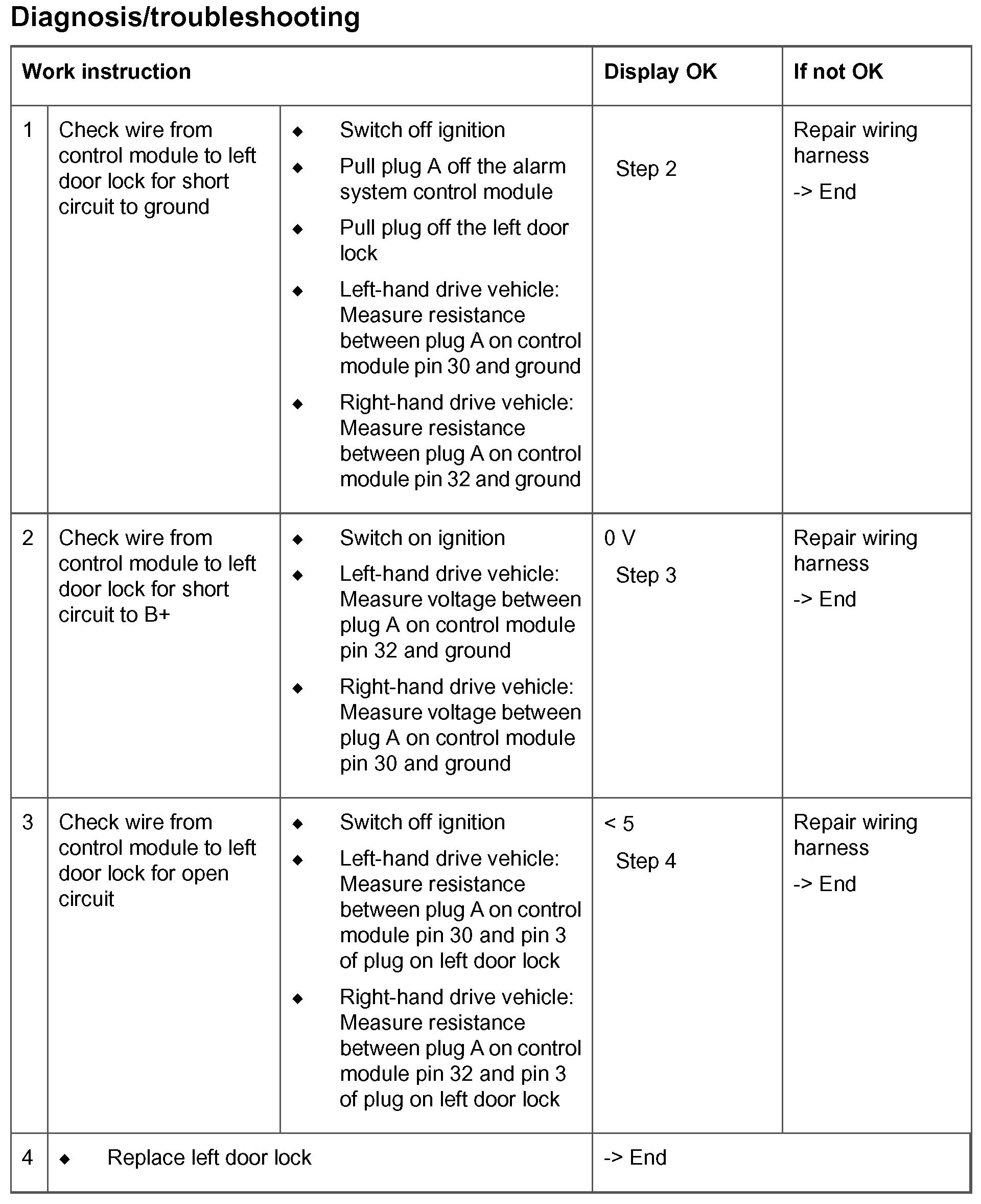 - Short circuit to ground in the wiring between the alarm system control module and the left door lock