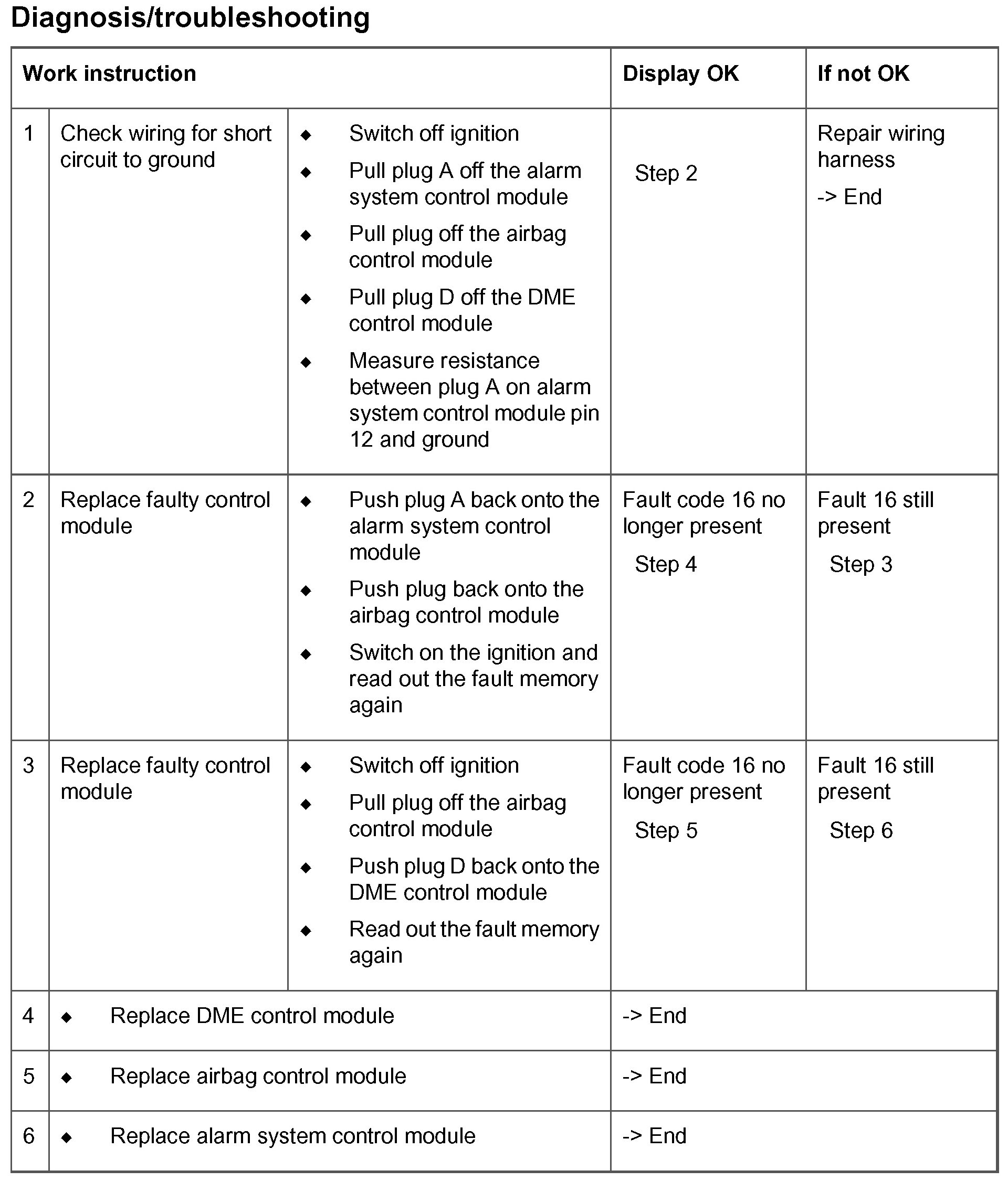 - Short circuit to ground in wiring between the alarm system control module and the airbag and DME control modules