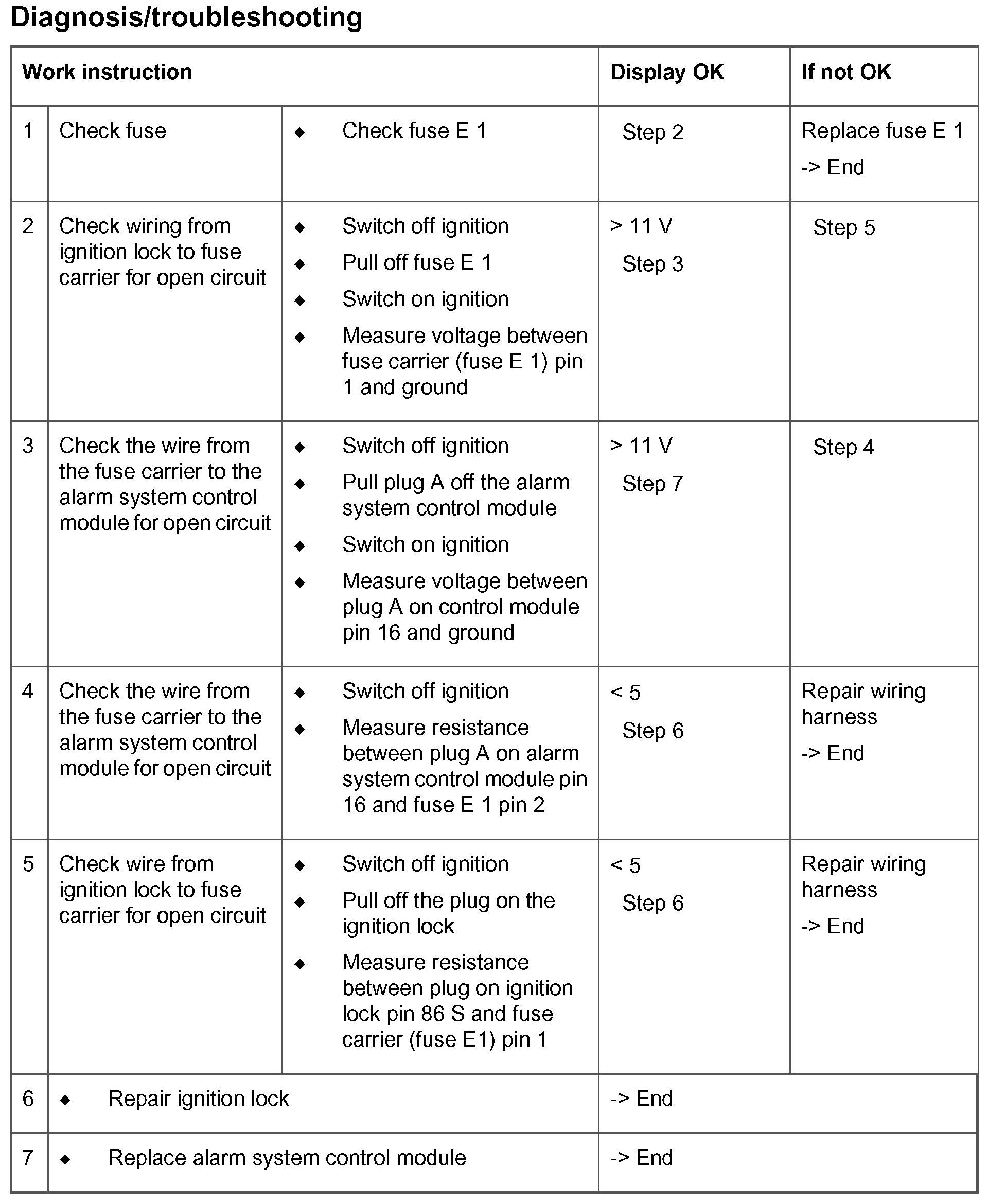 - Short circuit to ground/open circuit in the wiring between the alarm system control module and the ignition lock