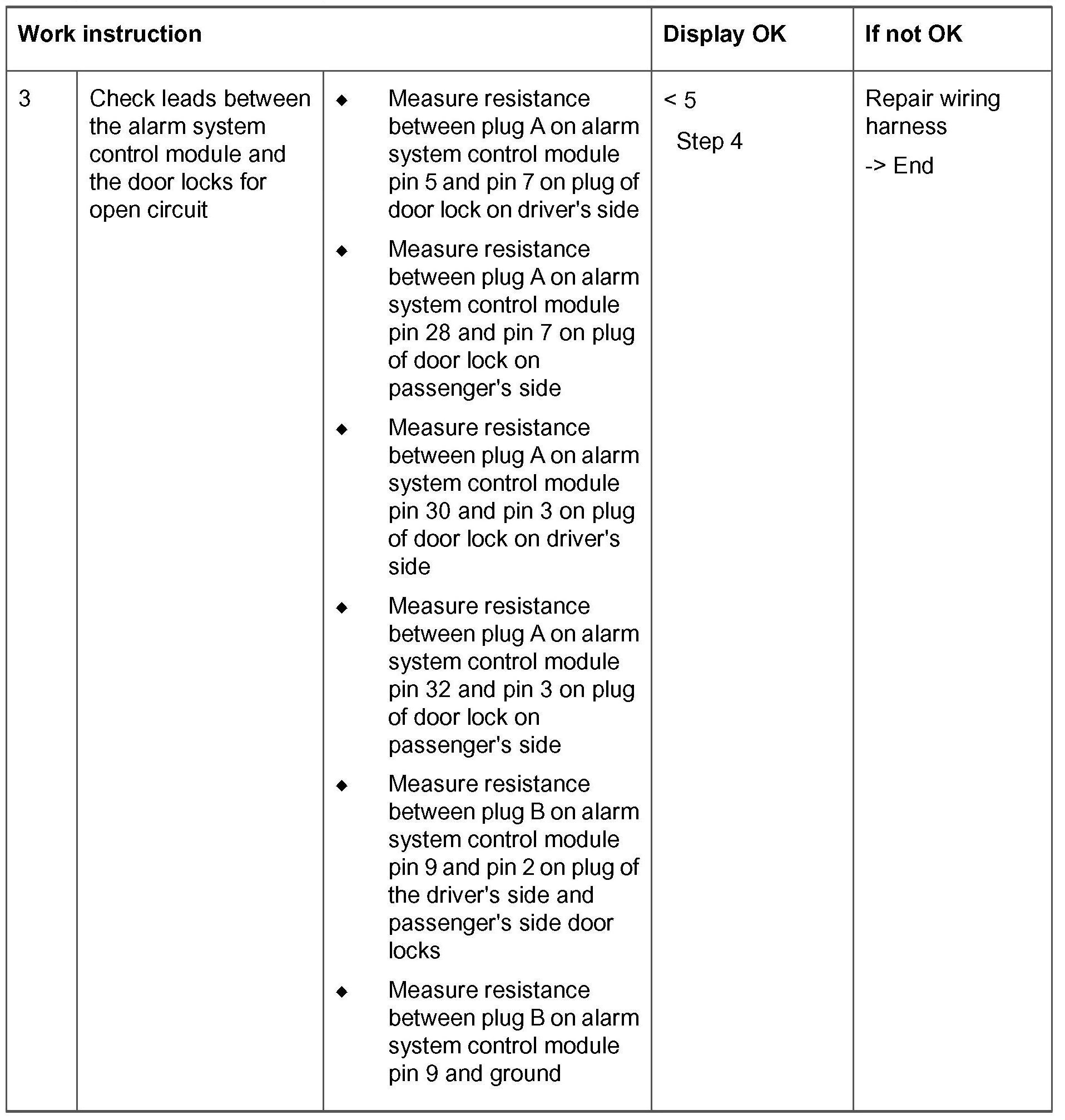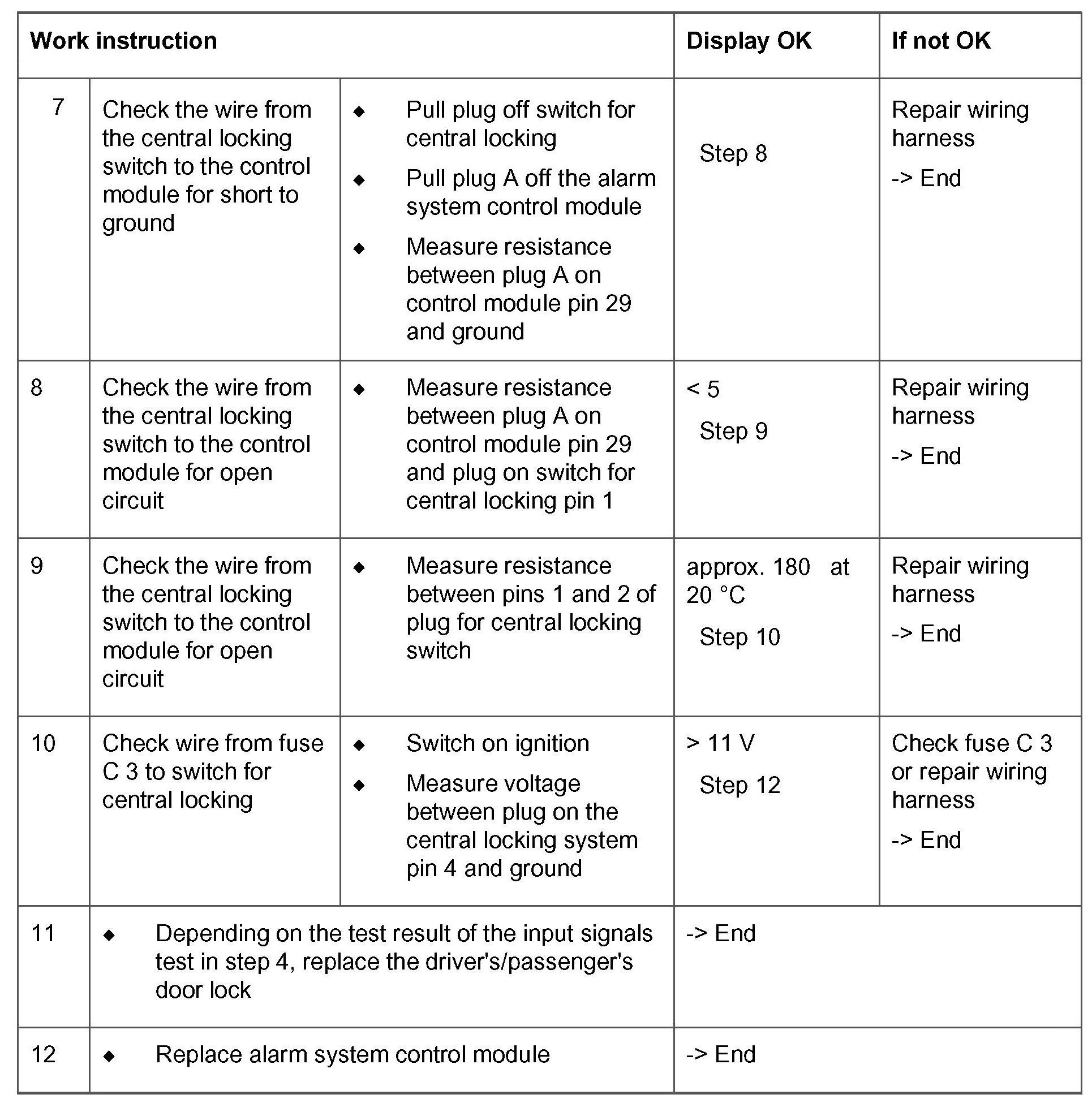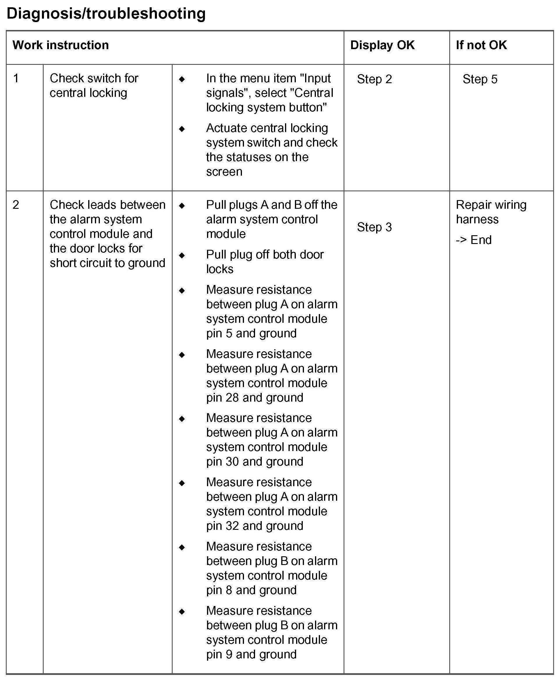- Short circuit to ground/open circuit in the wiring between the alarm system control module, switch for central locking or door locks
